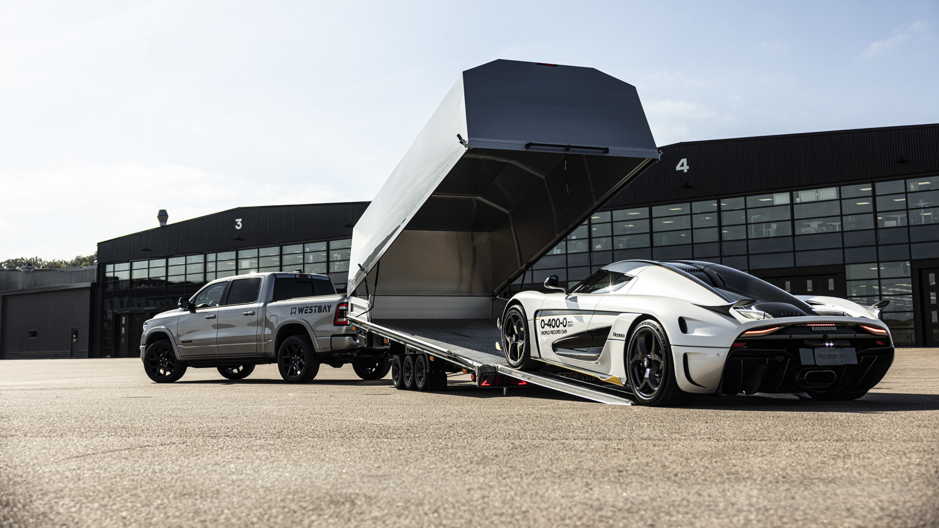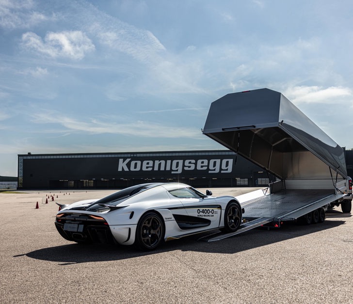 Vår svenska supersportbil Koenigsegg åker tryggt och säkert i Raceliner biltransportsläp.