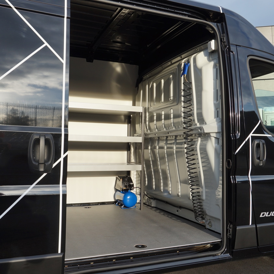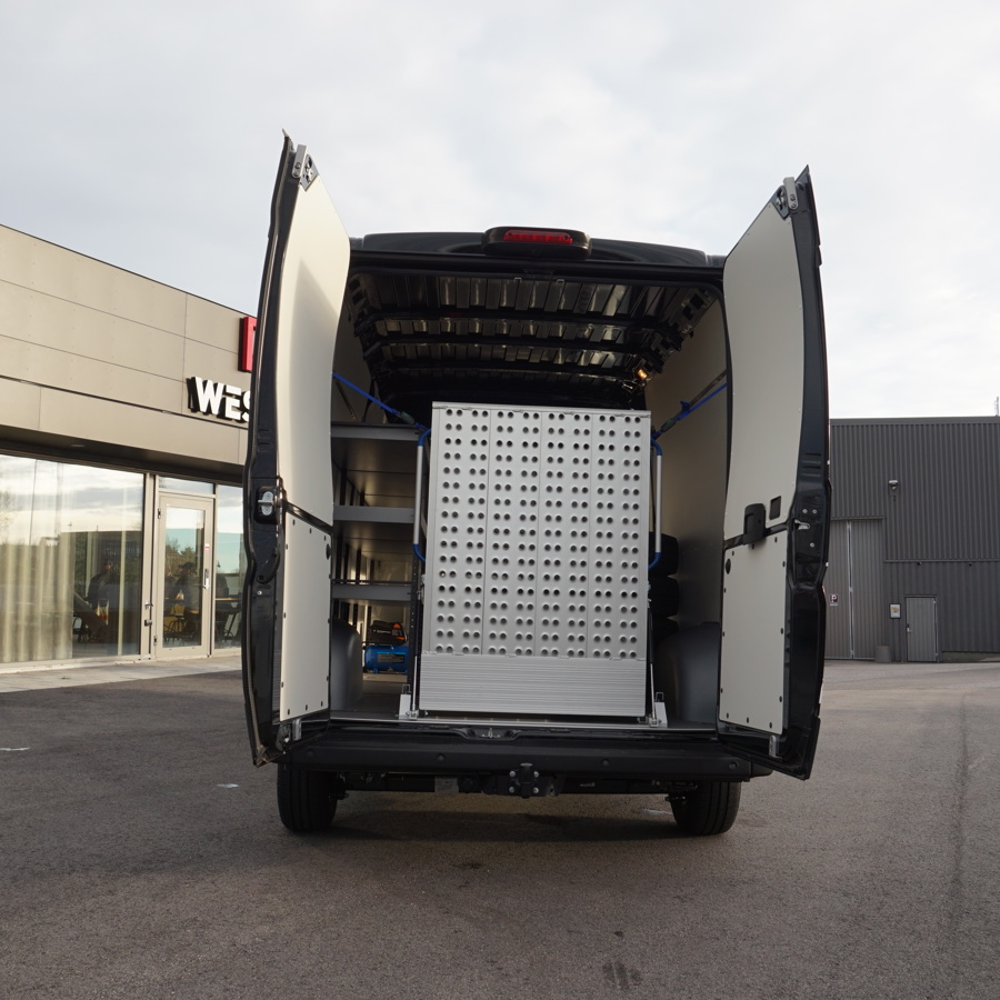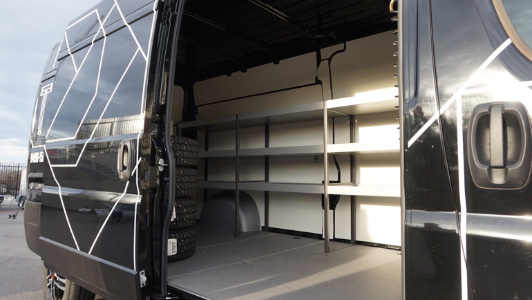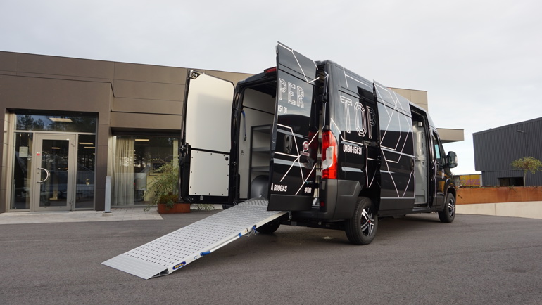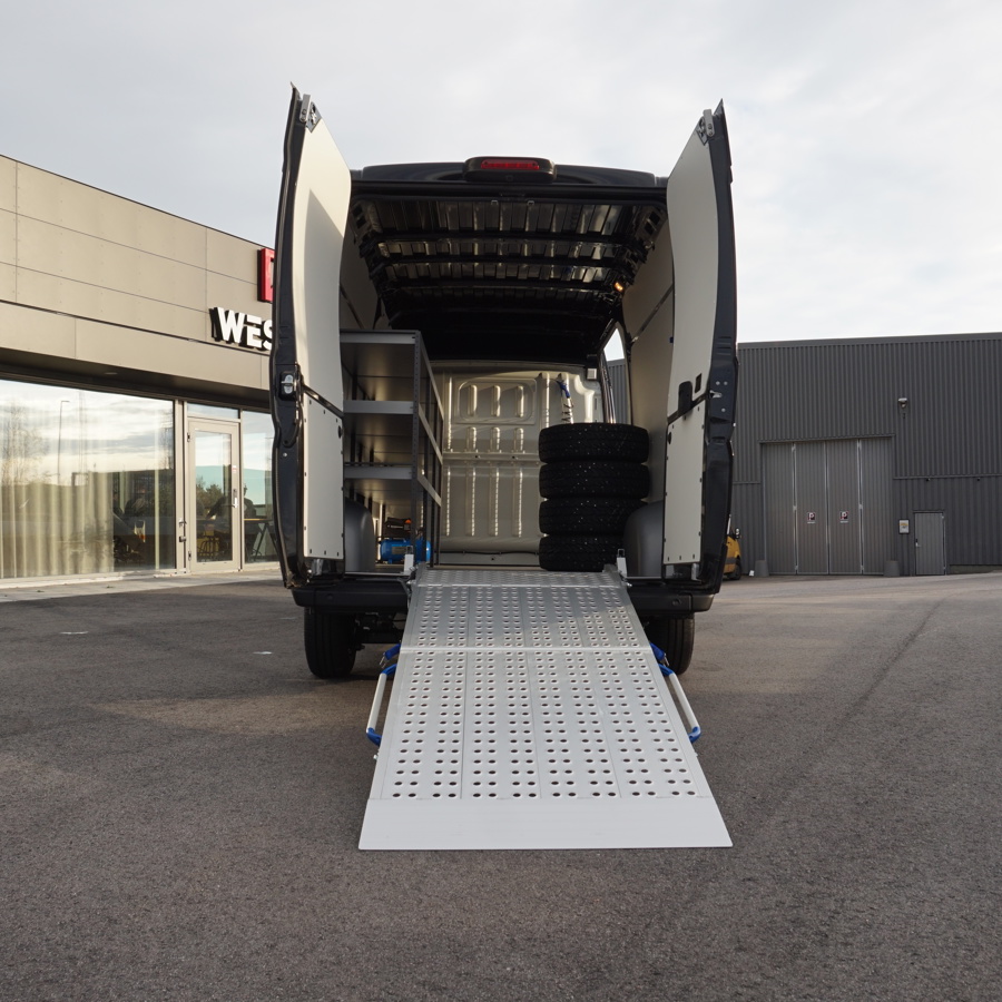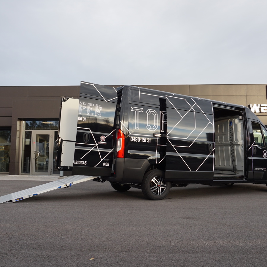 Fiat Ducato Gasbil / CNG är en miljövänlig och framtidssäkrad skåpslösning, Svart / Blankpolerade aluminiumfälgar, folierad i specialmönster efter kund önskemål, krocktestad inredning från System Edström tillsammans med dubbelvikt lastramp mot bakre dubbeldörrar, kompakt kompressor för enkel rengöring av arbetskläder som i skåp, högt placerat bromsljus.
