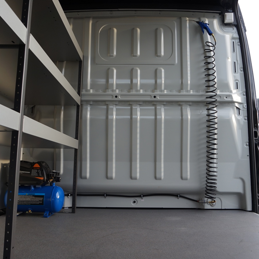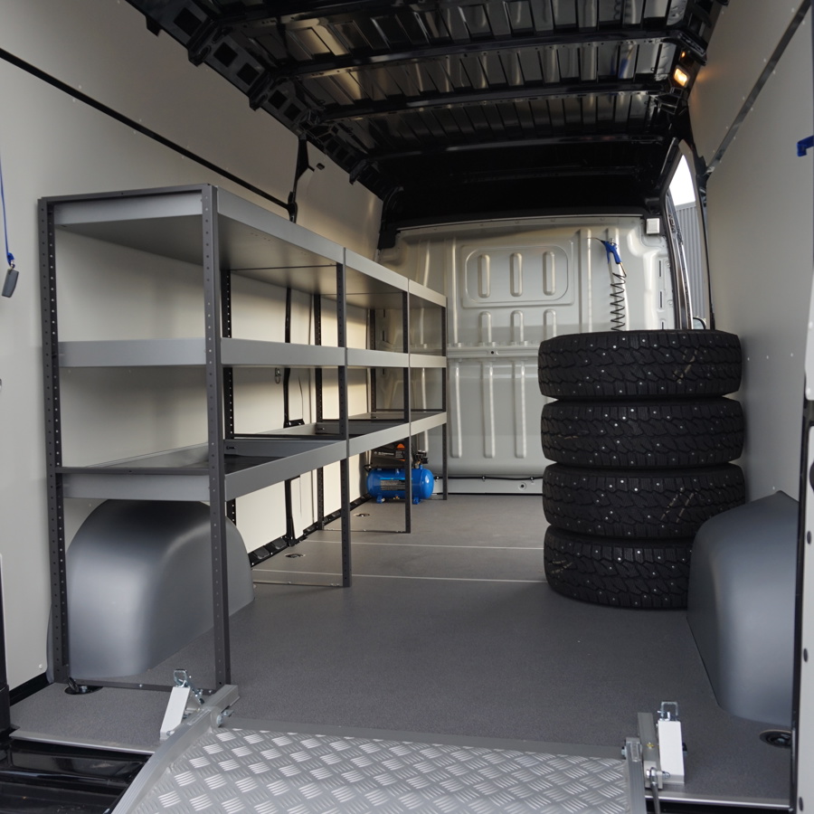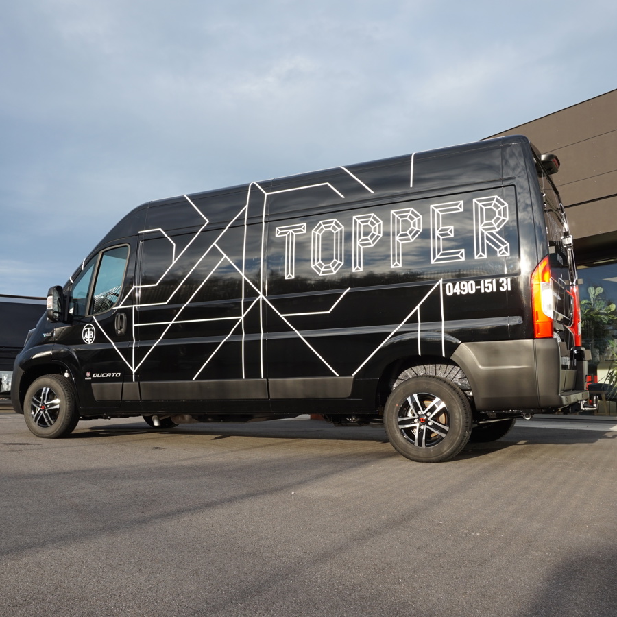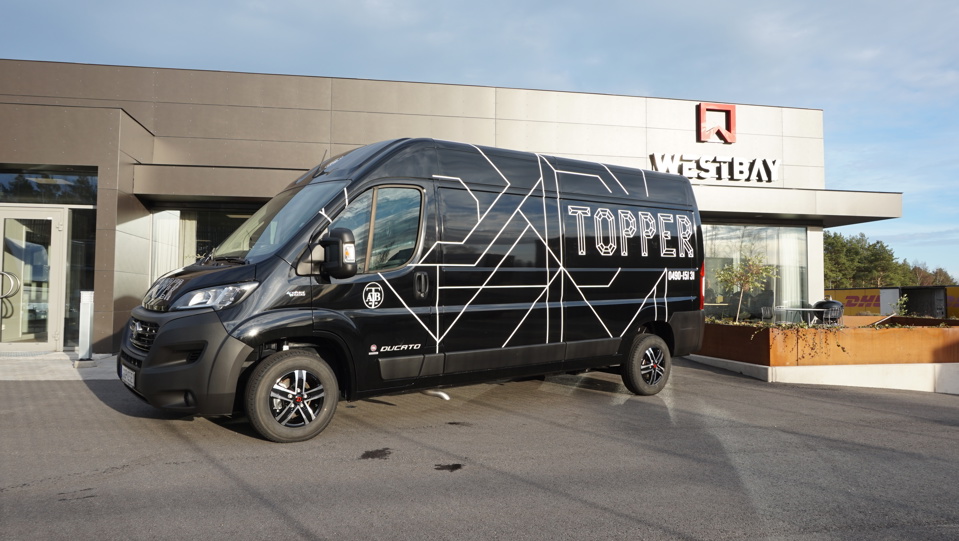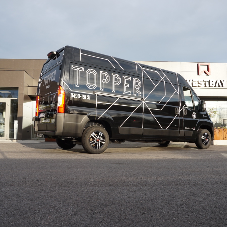Fiat Ducato Gasbil / CNG är en miljövänlig och framtidssäkrad skåpslösning, Svart / Blankpolerade aluminiumfälgar, folierad i specialmönster efter kund önskemål, krocktestad inredning från System Edström tillsammans med dubbelvikt lastramp mot bakre dubbeldörrar, kompakt kompressor för enkel rengöring av arbetskläder som i skåp, högt placerat bromsljus.