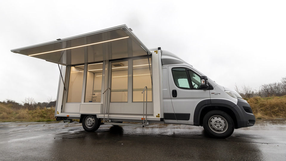 Mässbil baserad på Fiat ducato chassi med stor anpassad sidolucka, lås- & skjutbart glasparti, LED-lister i skåpstak och på lucka, takmonterad air-condition, utdragbart sidotrappsteg för enklare insteg i skåp samt bakre stödben på justerbara svivelfästen för snabb och enkel etablering.