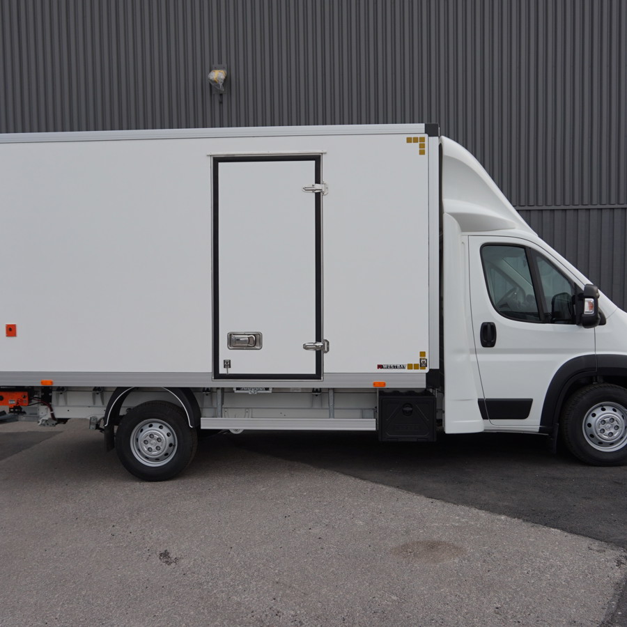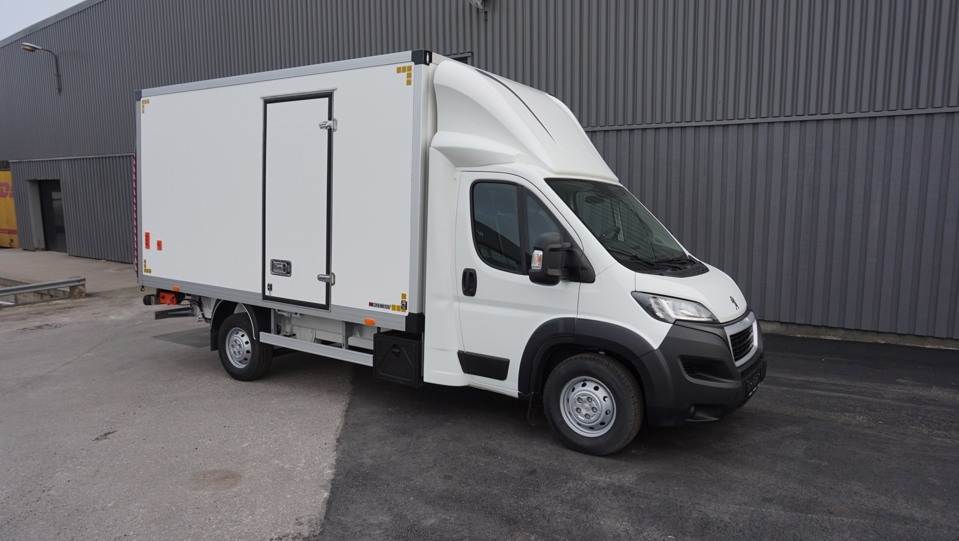 Peugeot Boxer L4 Blue HDi Volymskåp utrustad med Dhollandia bakgavellyft med liftlucka, 3-sitsig hytt med dubbelsäte för passagerare, Sidodörr för enkel åtkomst av skåp, GPS (Navigation), Vindavvisare för skåpssidor samt tak.