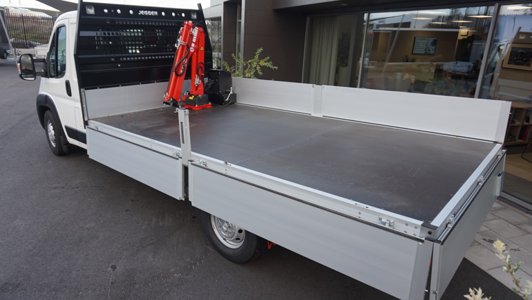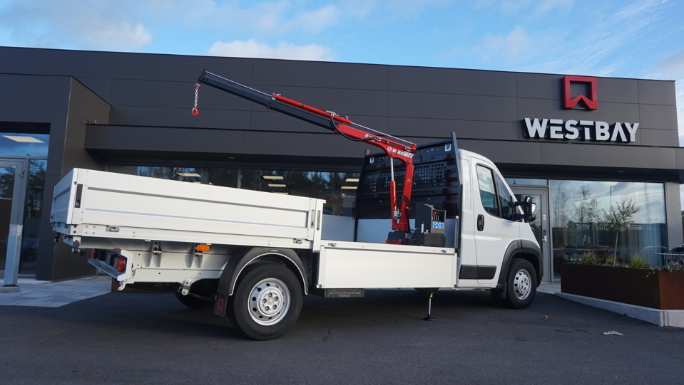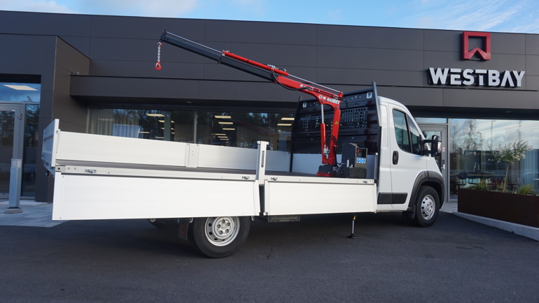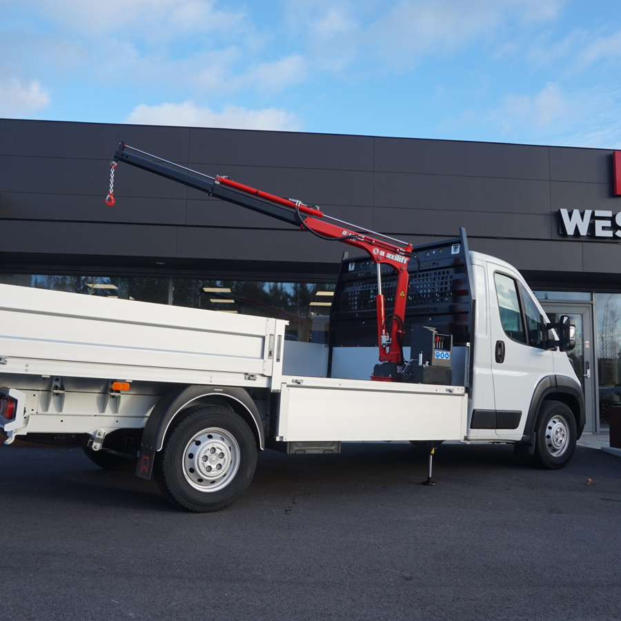 4-cylindrig dieselmotor med 165 hk, framhjulsdrift, manuell växellåda 6G, axelavstånd L4, vit solid kulör, förarstol med armstöd och värme, passagerarsoffa för två passagerare, förar- och passagerarairbag, navigator, Bluetooth-anslutning med handsfree, elektriska ytterbackspeglar, elektriska fönsterhissar, fjärrstyrt centrallås, automatisk klimatanläggning, regnsensor, läderklädd multifunktionsratt, läderklädd växelspaksknopp, farthållare. Eftermonterad utrustning och påbyggnad: flak med fällbara eloxerade aluminiumlämmar, flakmått längd 4200 mm, bredd 2100 mm, lämhöjd 350 mm, lastvikt ca. 900 kg, surrningsöglor i lastgolvet, fotsteg på baklämmen, framlastningsskydd med genomsikt, 1 st stor förvaringslåda, kranmontage mot framstam på passagerarsidan, kranmodell Maxilift 110.2, räckvidd kran 4,5 meter och där 200 kg, krankapacitet max 990 kg, två hydrauliska utskjut och två manuella utskjut, spakkontroll, hydrauliskt stödben på passagerarsidan.