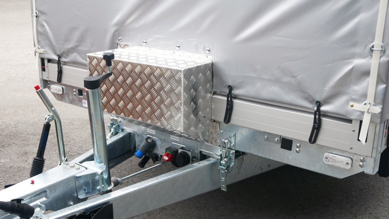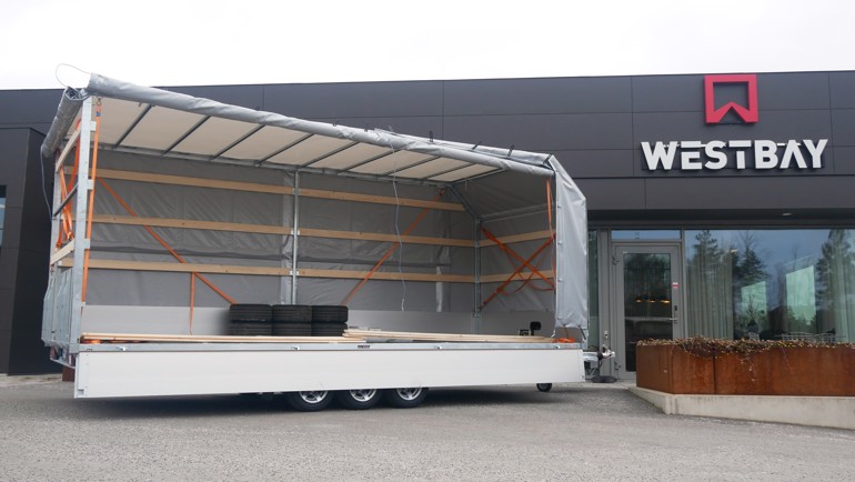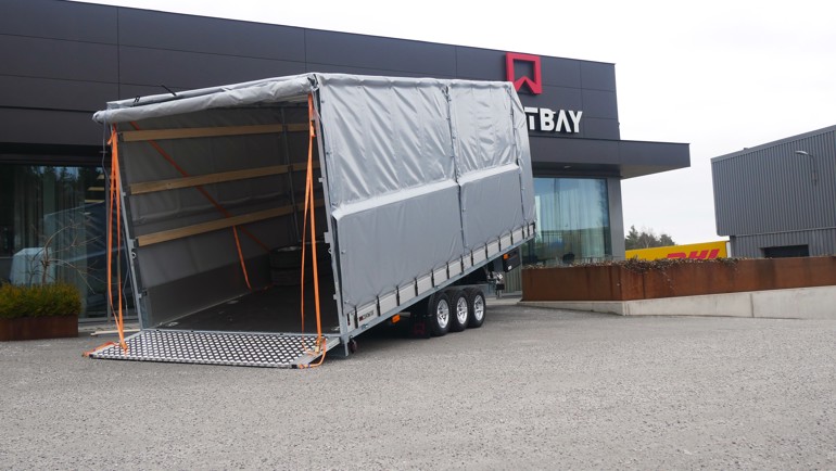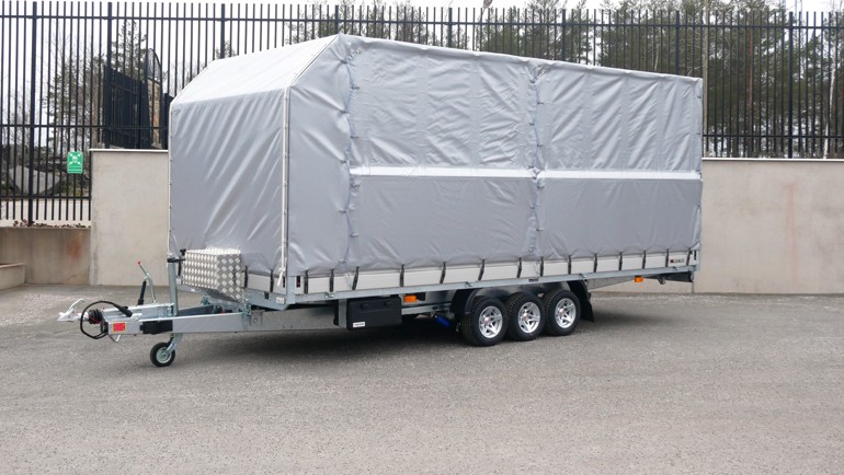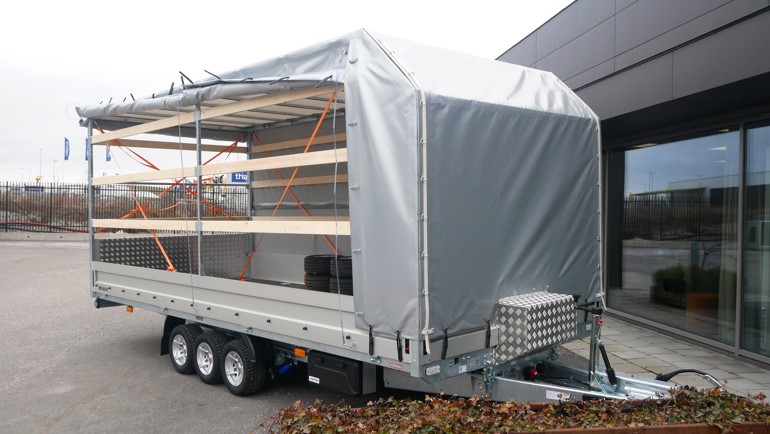 Adam multisläp med flakmått 5200x2100, med kapell som är öppningsbart baktill och på båda sidor. Enkelt att öppna och stänga tack vare sicksack-lösning och rullfjädrar. På sidorna är rullfjädrarna uppdelat i två sektioner för enklare hantering.