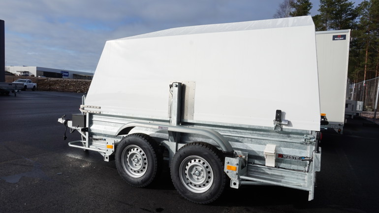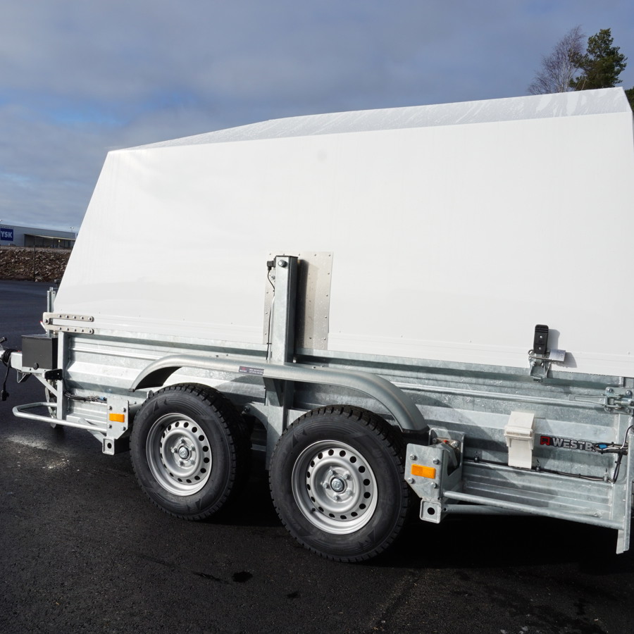 Just denna vagn utrustades med elektriskt höj- & sänkbart flak och transporterar under den vitlackerade kåpan, torra transporter både på sommar men framförallt vinterhalvårets blötare dagar!