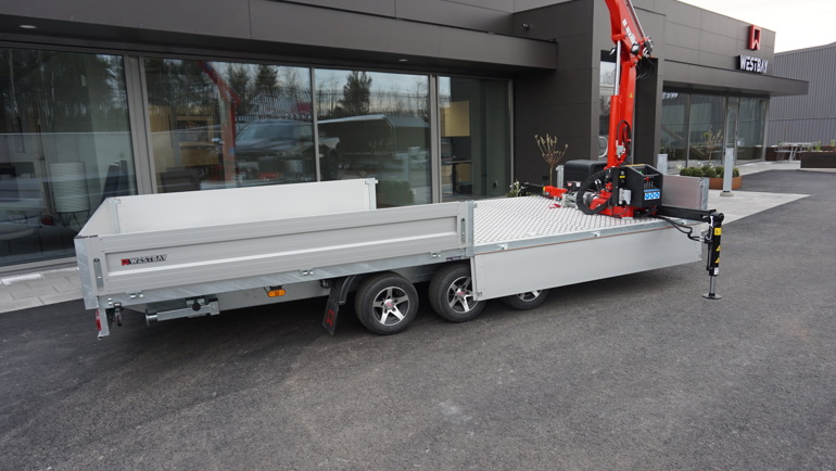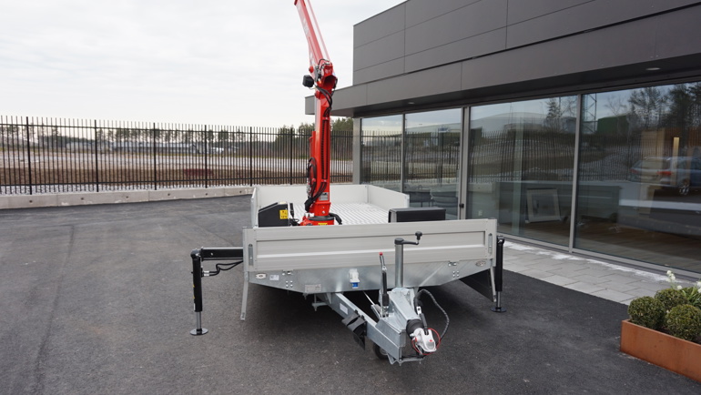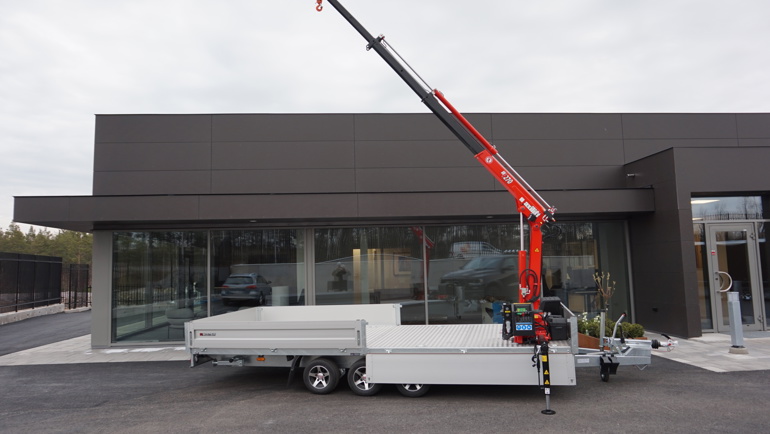 Vår flaksläpvagn Donna byggs i flertalet olika storlekar men flakmåttet 5020x2000 mm är ett av våra populäraste. Kunden i det här fallet var en uthyrningsfirma för byggmaskiner som behövde en vagn med hög lastkapacitet och lyfthjälp monterad. Vi byggde vagnen med totavikten 3500 kg, treaxlat chassi med 10-tumshjul på vår egen aluminiumfälg och något isärdraget axelavstånd. I främre delen av vagnen insallerade vi en lyftkran Maxilift 270.3 med tre hydrauliska utskjut och ett manuellt. Räckvidden är hela 5,2 meter och där kapaciteten 400 kg. Lägst in klarar kranen att lyfta 990 kg.
