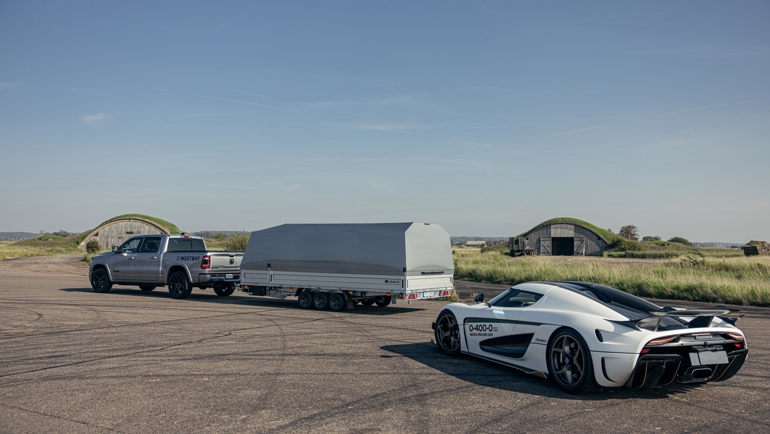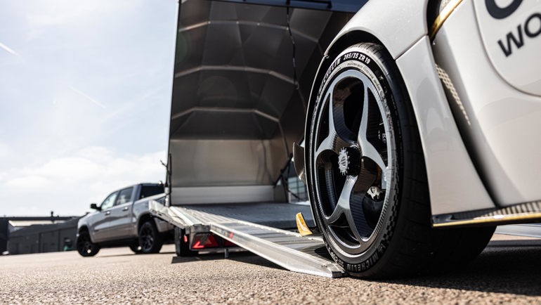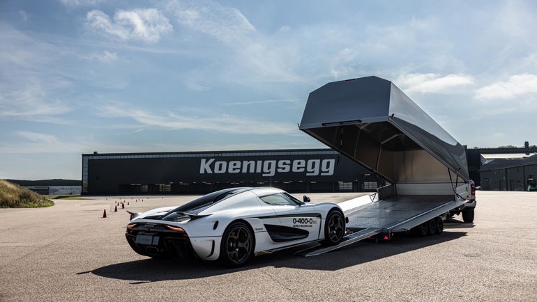 Vår svenska supersportbil Koenigsegg åker tryggt och säkert i Raceliner biltransportsläp.