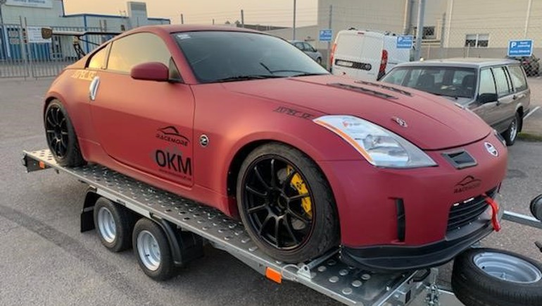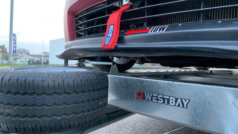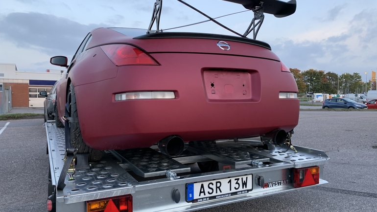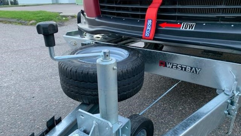 Med sina underliggande hjul och lätta hantering har Alfa snabbt blivit en populär modell. Flakmåttet 4000x2000 mm och lastvikt över 2000 kg så rymmer Alfa de flesta bilar. Den här kunden skulle lasta en låg banracingbil och därför gjordes ramperna något längre till det tippande flaket. Vagnen utrustades också med reservhjul i låsbart fäste samt manuell vinsch. De två justerbara hjulstoppen är standard.