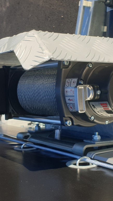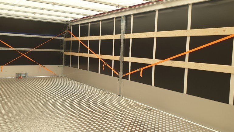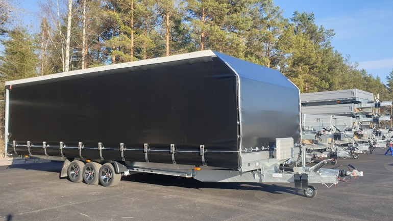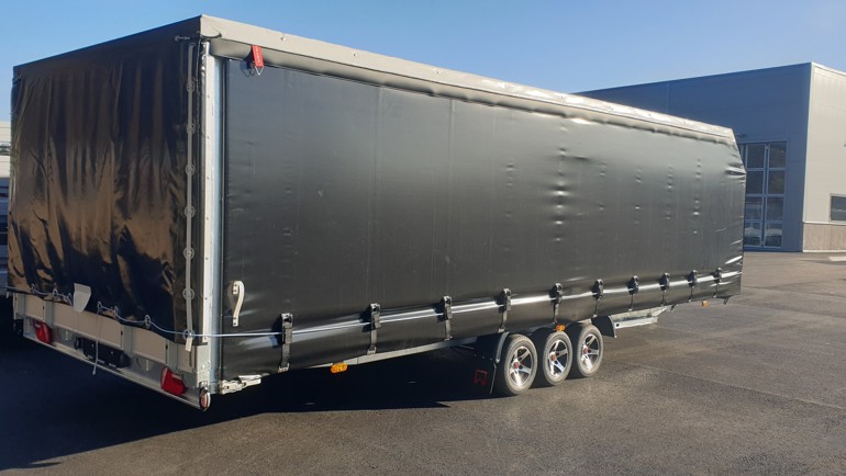 Frakta allt du vill torrt och enkelt. Vår multitransport Adam finns i ett nytt flakmått, 6600x2470 mm. Den här kunden skulle frakta allt möjligt gods från bilar till snickeridetaljer. Valet blev att bygga ett snyggt skjutbart kapell med innerhöjden 1600 mm i svart kulör. Utöver att kunna tippa ner flaket kan nu kunden öppna både sidor och tak på kapellet för lastning med truck eller travers. Kapellsträckarna runt om ger en tight passform utan större vindmotstånd. På framstammen monterades också en elvinsch från Warn med dragkraft 3600 kg.