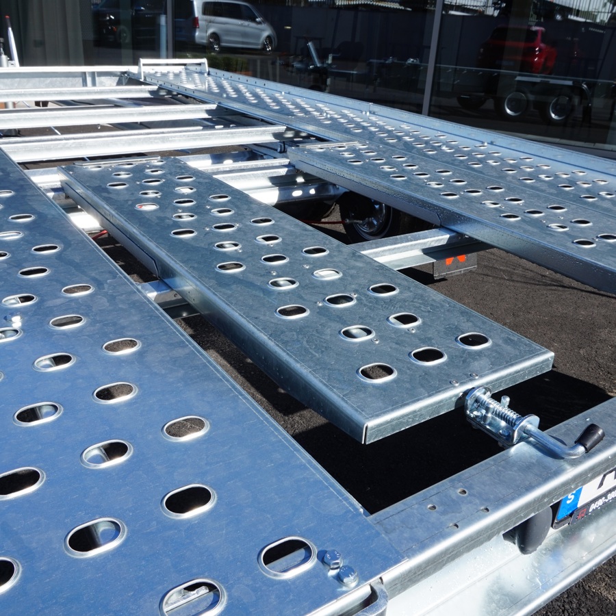 Alfa är tippbar och har två stycken lösa ramper på 1250 mm. Två stycken kraftiga hjulstopp ingår också och som kan placeras efter önskemål på körbanorna.