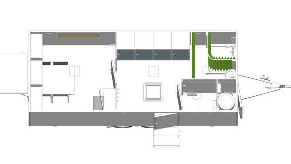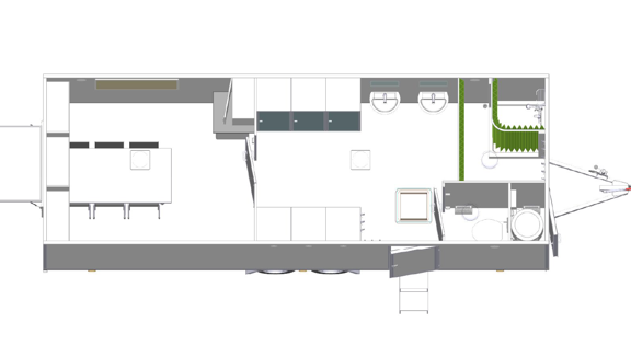 Manskapsvagn för 8 personer. Med omklädningsskåp, badrum, minikök och rastdel. Fasta inkopplingar.