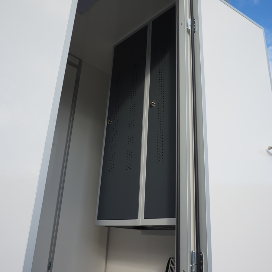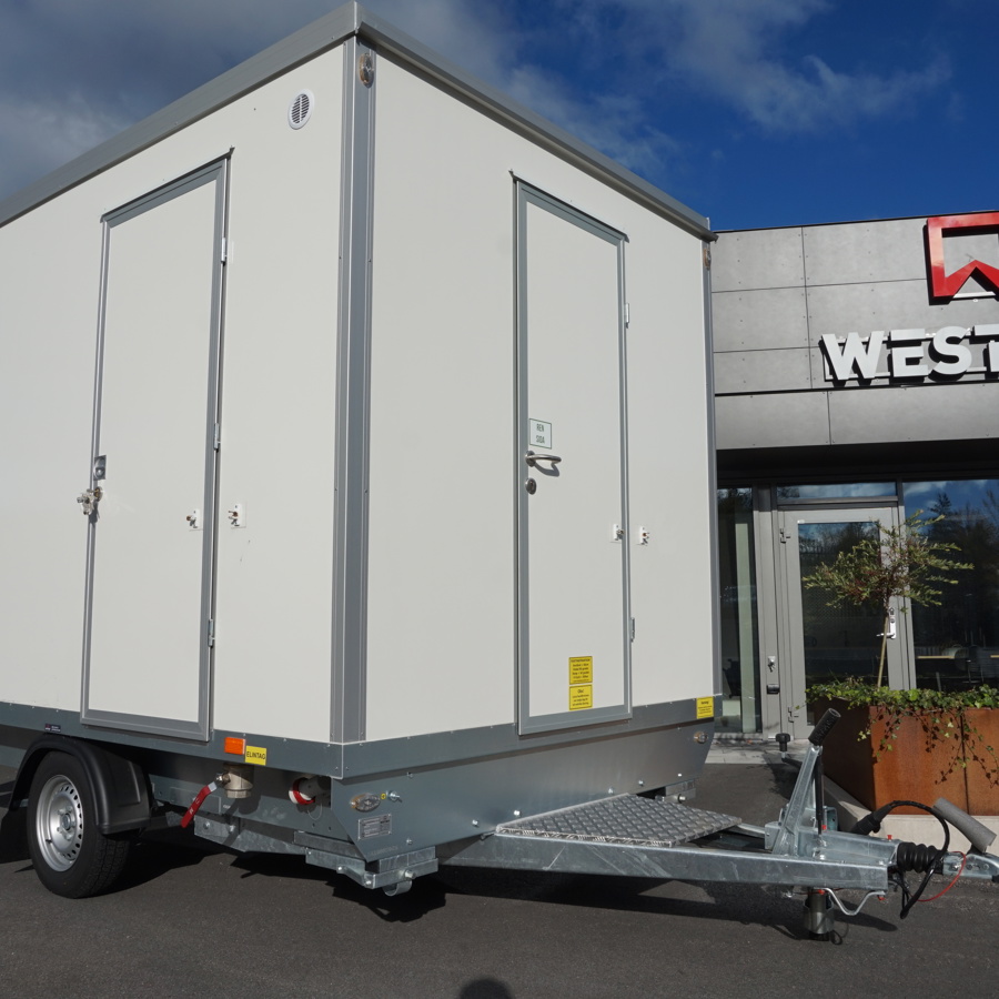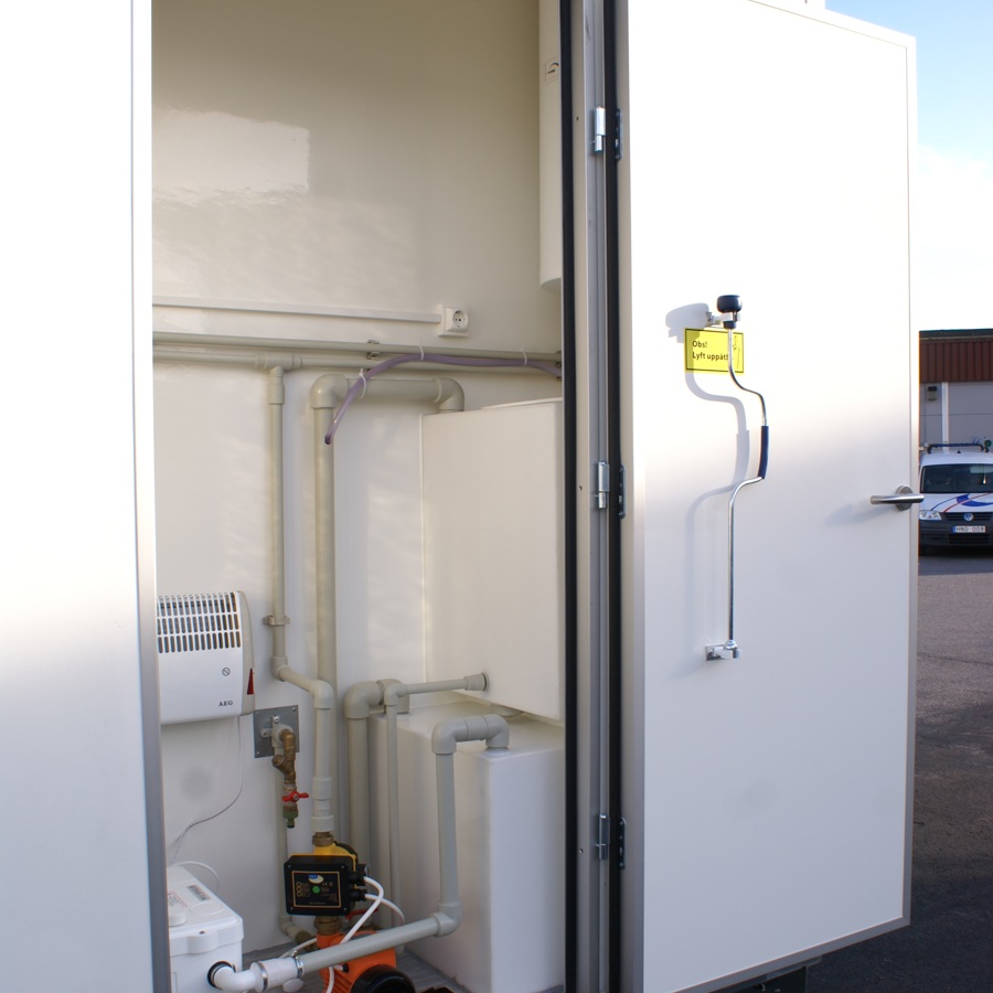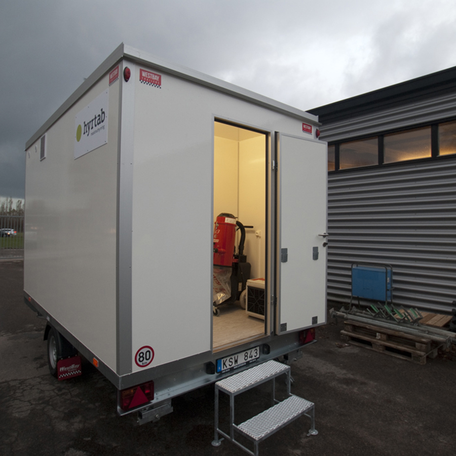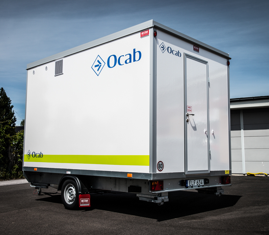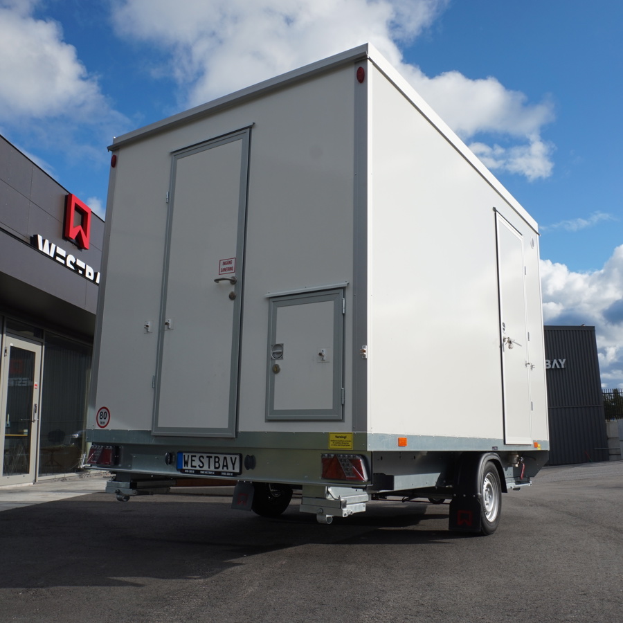 Trestegssluss med dusch och omklädning. Får köras i 80 km/h och flyttas enkelt mellan arbetsplatser.